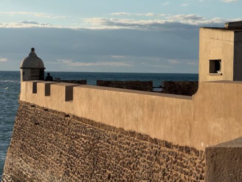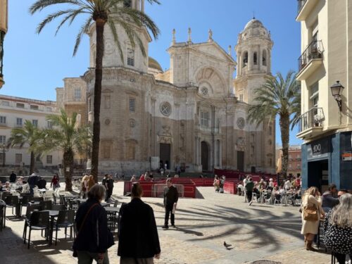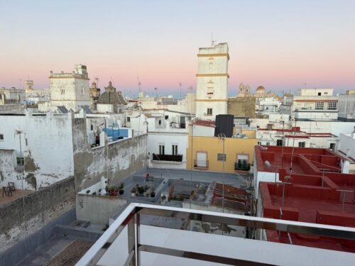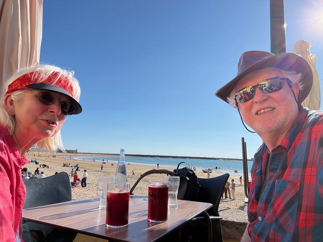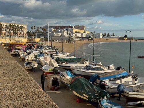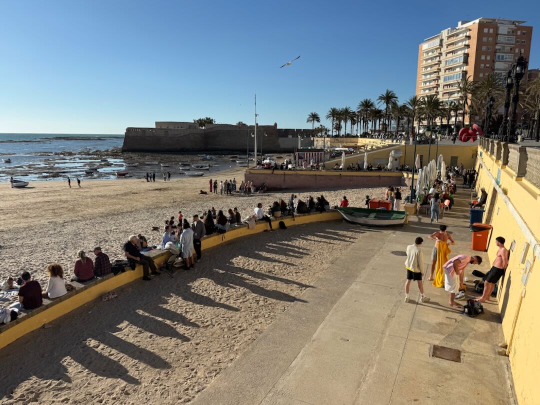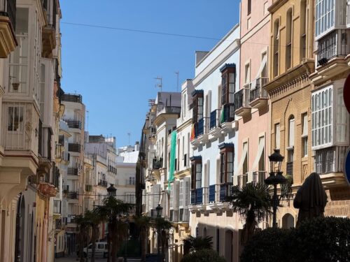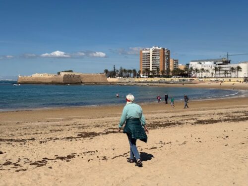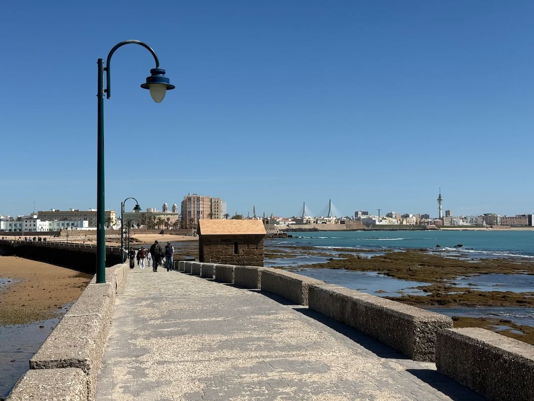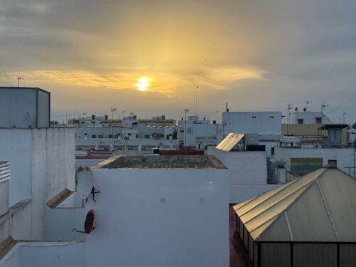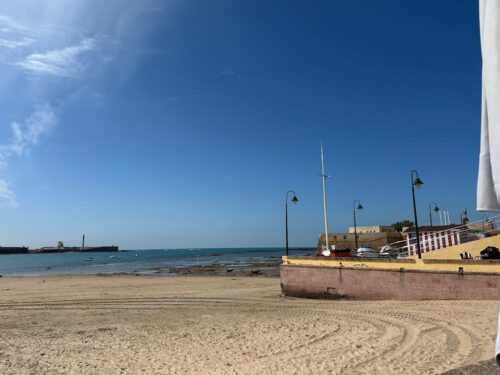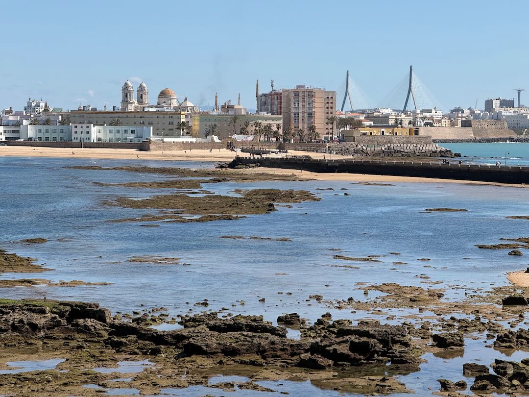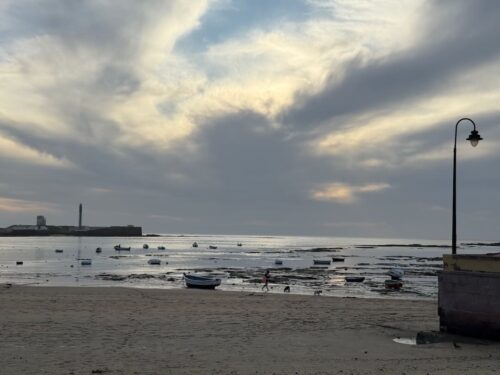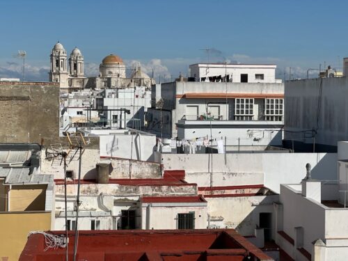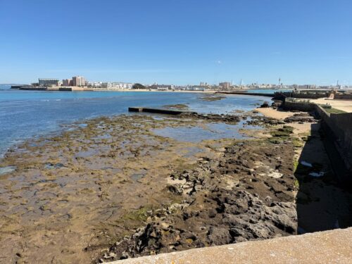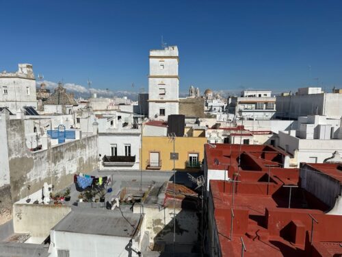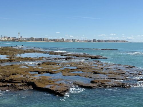 In Cádiz, der ältesten Stadt Westeuropas direkt am Atlantik im Südwesten Andalusiens gelegen, haben wir ein Apartment in einer kleinen Gasse mitten in der Altstadt. Die empfohlene Tapas-Bar um die Ecke, öffnet erst um 20:30 Uhr und wir reihen uns in die lange Schlage ein, um noch einen Platz zu ergattern. Die Sprachschule für den zweiwöchiger Sprachkurs ist in 10 Minuten Fußweg zu erreichen. Erst zwei Teilnehmern und ab dem zweiten Tag vormittags Einzelunterricht. Nachmittags haben Ruth und ich Zeit die sehr schöne Altstadt von Cadiz zu genießen. Leckeres Essen gibt es in den verschiedenen Tapas-Bars, im Fisch-Restaurant oder an der Bar direkt am Stadtstrand. Die langen und noch einsamen Sandstände südlich Cadiz laden zu langen, sonnigen Strandspaziergängen im Wind des Atlantiks ein. Wochenausflug nach Jerez de la Frontera mit Besichtigung des Alcázar aus der maurischen Zeit des 11. Jahrhunderts.